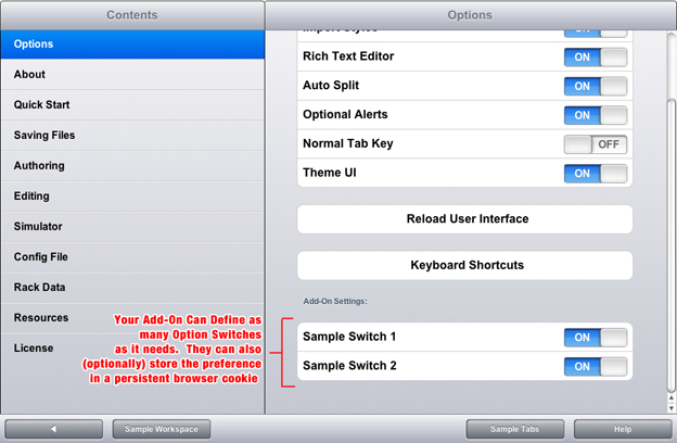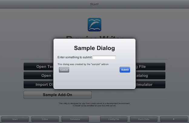 sample & sample2 - The "sample" add-on is a demonstration of the various things a Writer Add-On can do, including "chain loading" the "sample2" add-on and auto-installing a "sample" add-on to Reader. You'll notice that it is commented out in the "writer.config.js" file.