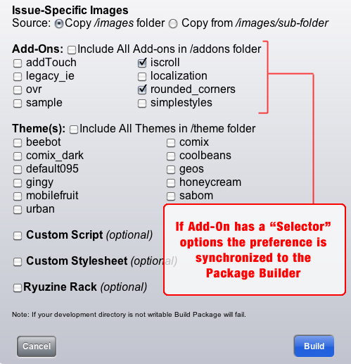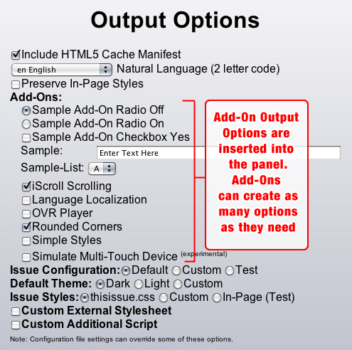 PACKAGING: Even if there is no Output Option selector the list of Add-ons on the Package Builder Panel "Custom Package" option is generated from whatever folders it finds in the READER (not Writer) /addons folder. So you can still include/exclude the Reader add-on. However, if there is a checkbox on the Output Options panel it will automatically synchronize your add-on selections on that panel with the ones on the Package Builder > Custom Package section. It re-sync's every time you open the Package Builder panel: