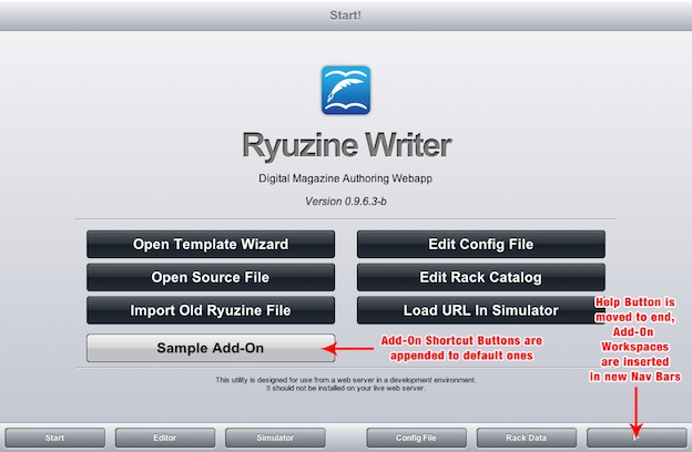 The Ryuzine PDK includes a "sample" Add-On package (and a "sample2" package). If you uncomment "sample" in the "machine.config.js" file this sample add-on will load and it will do every one of the above functions to show you how they work. If you look at the ~/ryuzinewriter/addons/sample/sample.config.js file it is heavily commented with instructions on how to build your own add-ons.