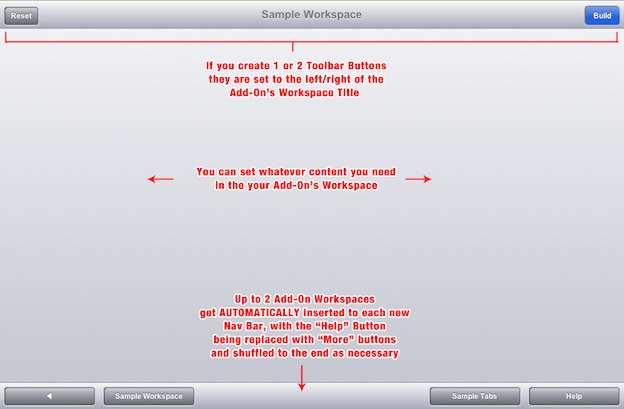 "id" is the object identifier for your workspace (it gets prefixed with "addon_ws_") "title" is the name in the title bar (if there will be one). If you omit "label" it is also used on the nav button. "contents" is an array of the HTML code to write into the workspace. "opt" (optional) is an array of buttons for the toolbar on your workspace. "label" (optional) is the text for the nav button (if omitted "title" text will be used).