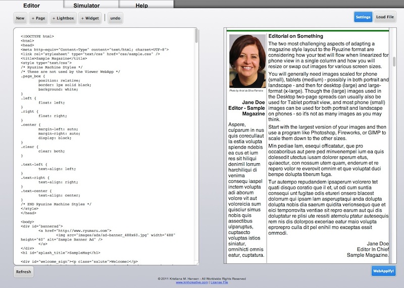 This, however, is a bit clumsy and editing the CSS in the Export box or in Source mode is very basic. A preferred workflow would be to use external stylesheets and have them open for editing in a proper code editor. You simply re-save your stylesheet and then jump back to Ryuzine Writer and rebuild the publication to see the changes in the Simulator.