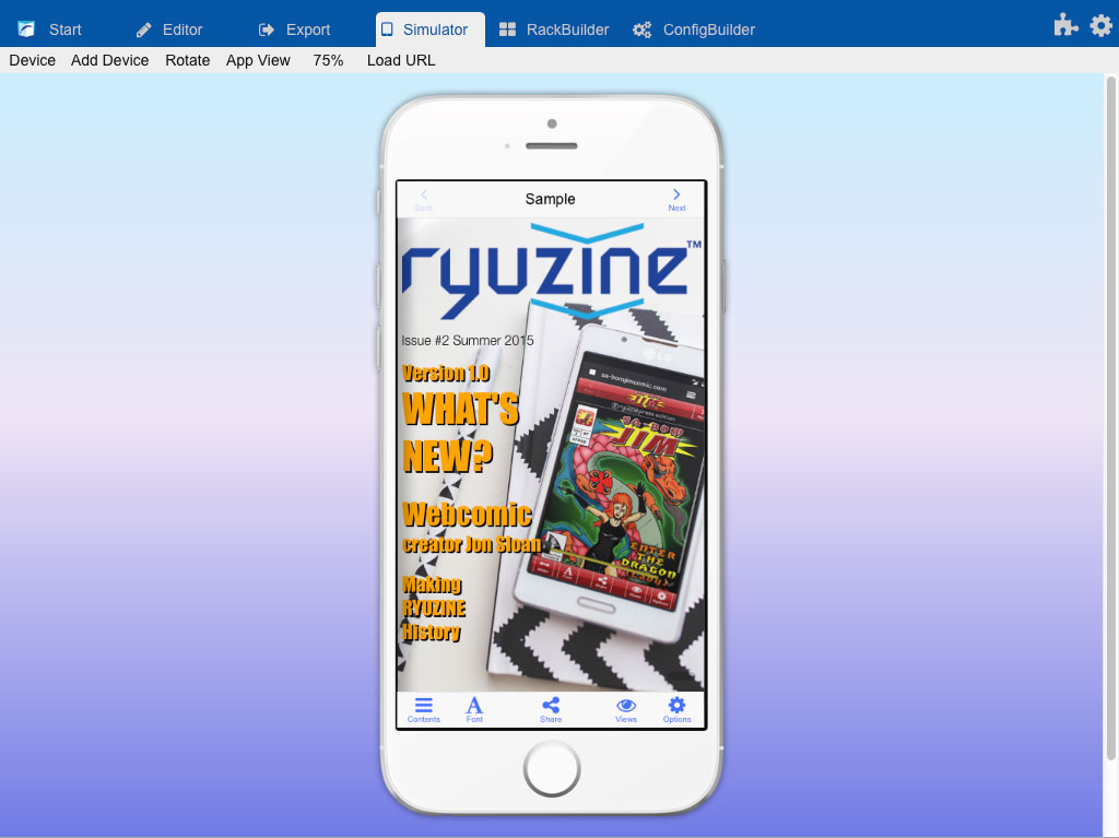 Ryuzine Writer also includes a “Config Builder” utility for creating custom Ryuzine and Ryuzine Rack configuration files. Just pick and enter the options you want and hit the “Build” button – you instantly get perfectly formatted configuration file code every time. You can also test it out in the Device Simulator before you save it.